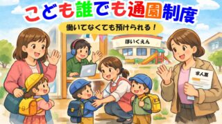 家計と制度 【新たな子育て支援】『こども誰でも通園制度』とは?制度の中身と現場の課題をQ&Aで整理 子ども・子育て支援金制度の柱の1つ、「こども誰でも通園制度」。これまで保育園は働く親のための施設だったのが、読んで字のごとく就労如何に関係なく「保育施設が利用可能」になる制度。子育て支援として評価される一方、短時間利用や地域差といった限界もあります。この制度の狙いと課題をQ&Aで整理しました。 2026.01.13 家計と制度暮らし